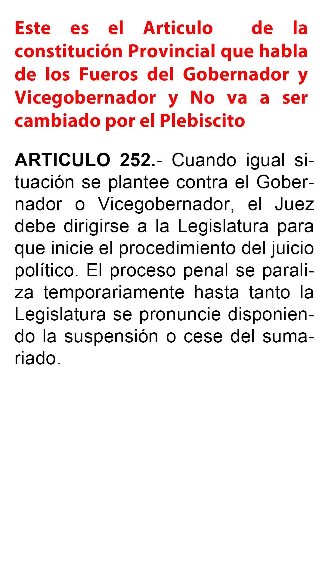 El artículo 252 establece que, si el Gobernador o Vicegobernador fueran acusados, el juez debe solicitar a la Legislatura el inicio del juicio político y suspender el proceso penal hasta que se pronuncie. De esta manera, el Ejecutivo conserva una inmunidad que no alcanzaría a los otros actores institucionales.