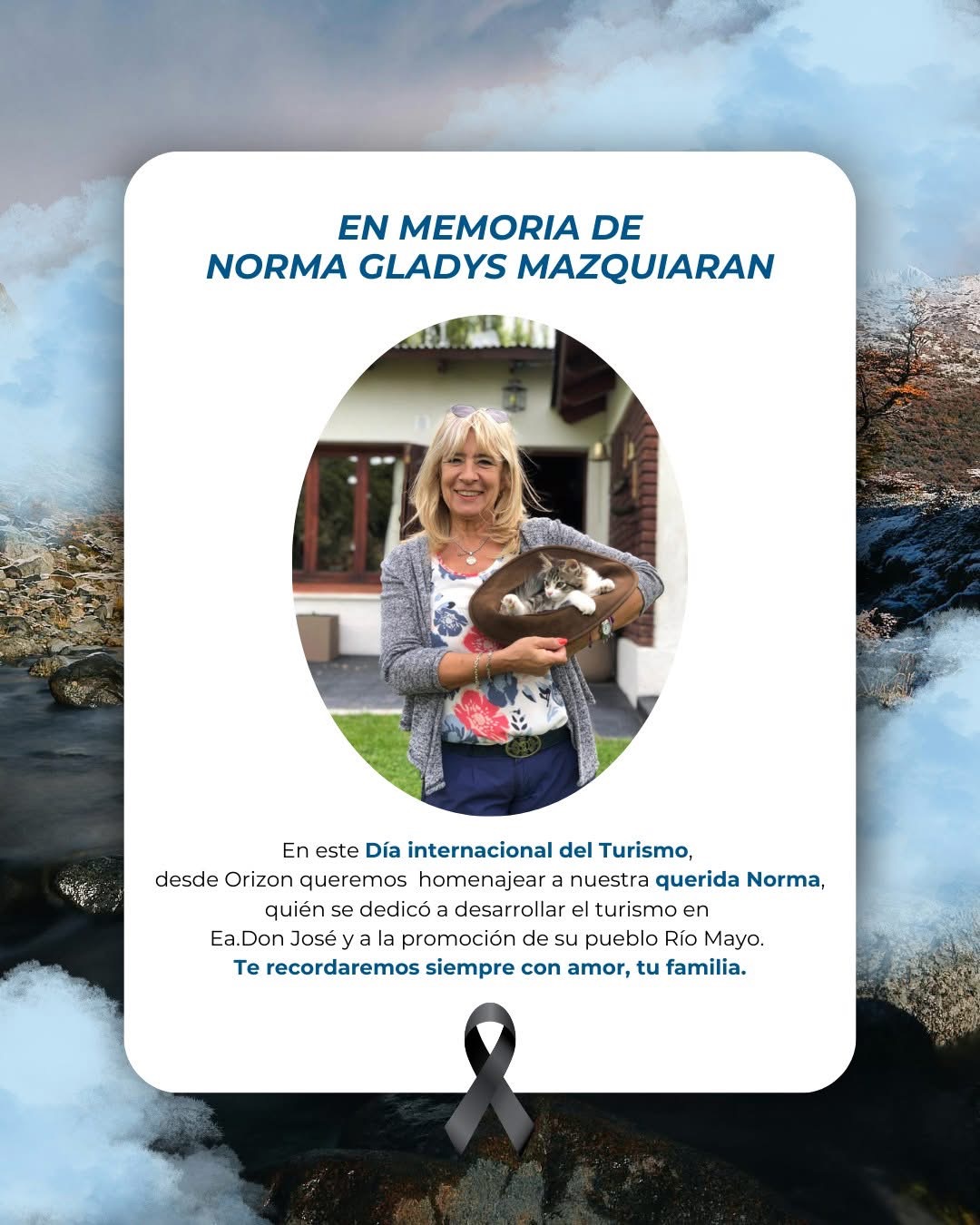 En el marco del Día Internacional del Turismo, celebrado el pasado 27 de septiembre, la empresa Orizon rindió un emotivo homenaje a la memoria de Norma Gladys Mazquiarán, hermana de los propietarios de la firma y referente indiscutida del turismo local.