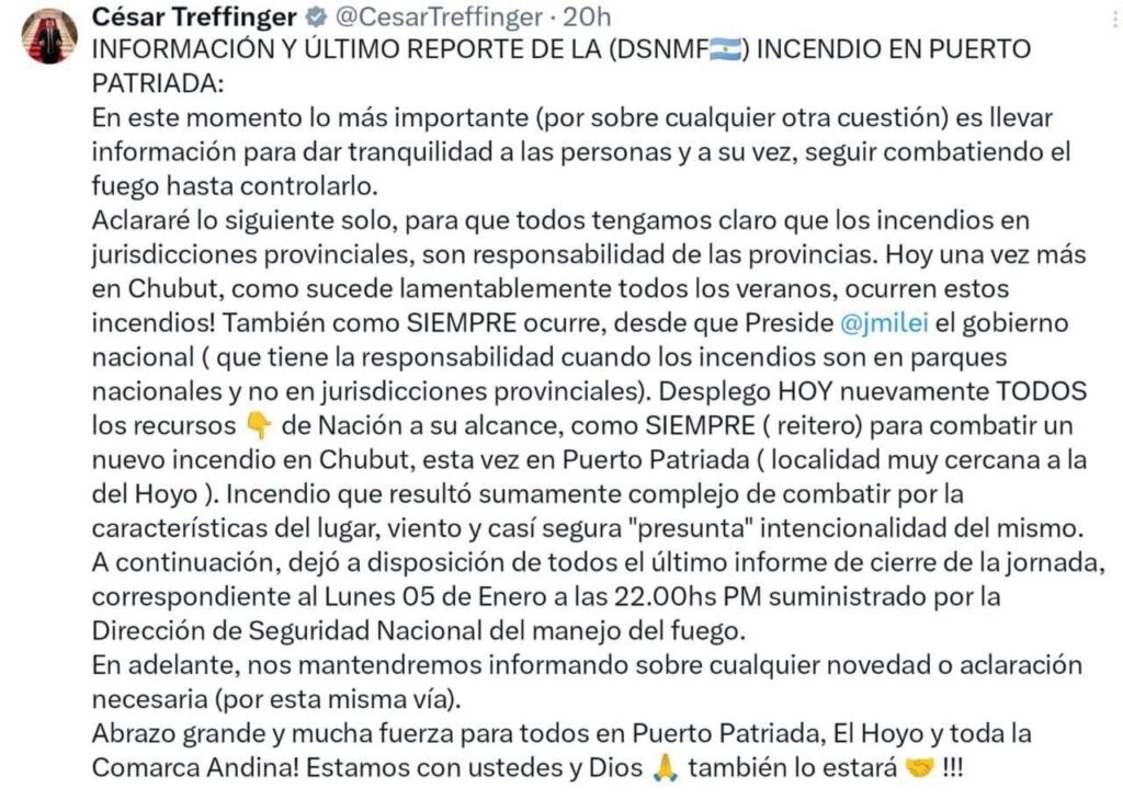 En medio de la emergencia por el incendio forestal que afecta al paraje Puerto Patriada, el intendente de El Hoyo, César Salamín, salió al cruce de una publicación del diputado nacional César Treffinger, luego de que el legislador incurriera en un error geográfico y utilizara un tono político en un contexto atravesado por la emergencia.