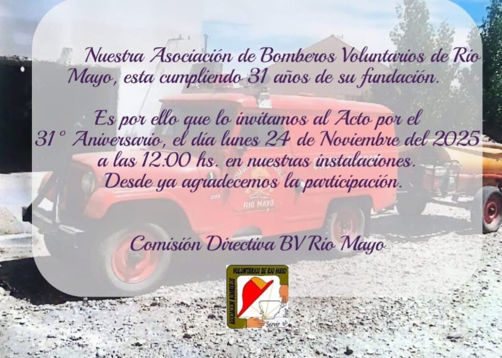 La Asociación de Bomberos Voluntarios de Río Mayo cumplió el pasado 18 de noviembre su 31° aniversario institucional. El acto conmemorativo había sido programado para este lunes 24 a las 12:00 en el cuartel, con la presencia de autoridades, vecinos e integrantes históricos de la institución. Pero al momento de iniciar, solo un miembro del cuerpo activo estaba presente, lo que impidió realizar la ceremonia prevista.