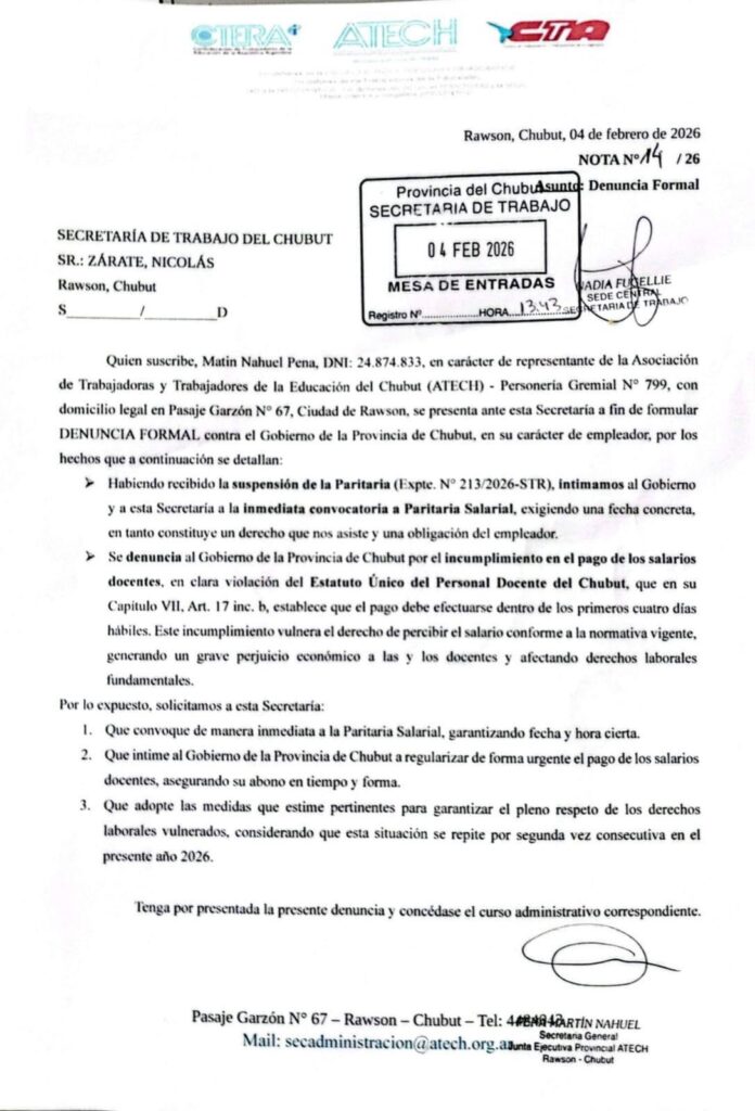 La Asociación de Trabajadoras y Trabajadores de la Educación del Chubut (ATECH) presentó este martes una denuncia formal ante la Secretaría de Trabajo de la provincia contra el Gobierno del Chubut, en su carácter de empleador, por la suspensión de la paritaria salarial y el incumplimiento en el pago de los salarios docentes.