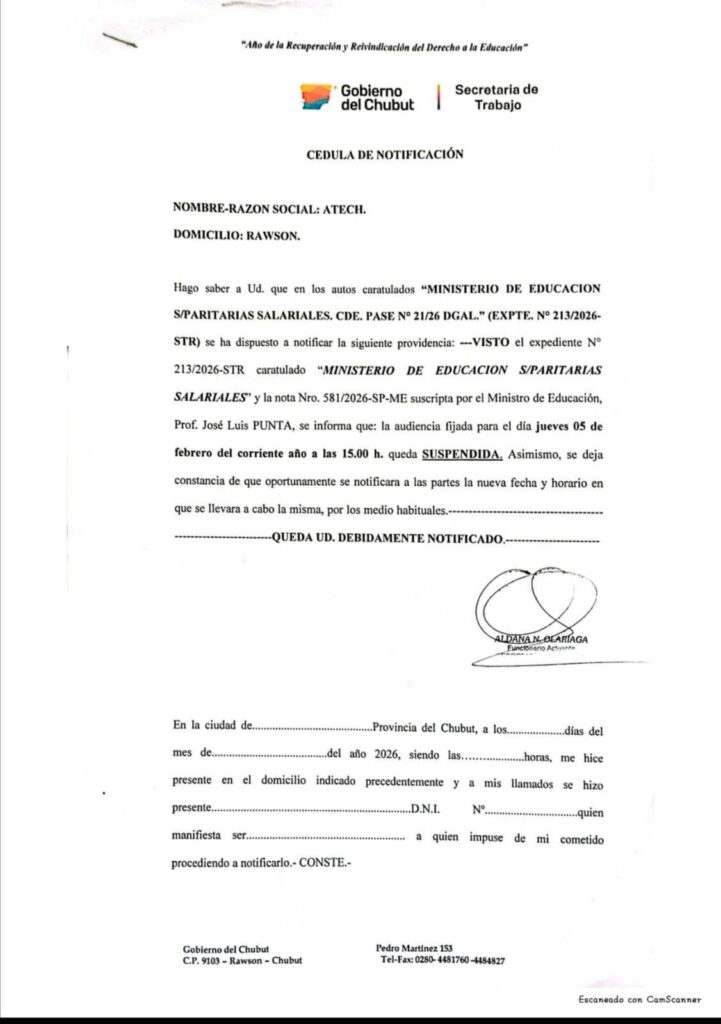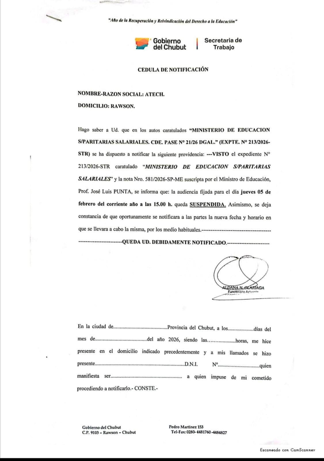 Entre los puntos centrales, ATECH cuestiona la suspensión de la audiencia paritaria fijada en el expediente N.º 213/2026-STR, la cual debía realizarse el jueves 5 de febrero a las 15 horas. Dicha suspensión fue notificada oficialmente mediante una cédula emitida por el organismo laboral, donde se informó que la reunión quedaba sin efecto y que la nueva fecha sería comunicada oportunamente, sin precisar día ni horario.