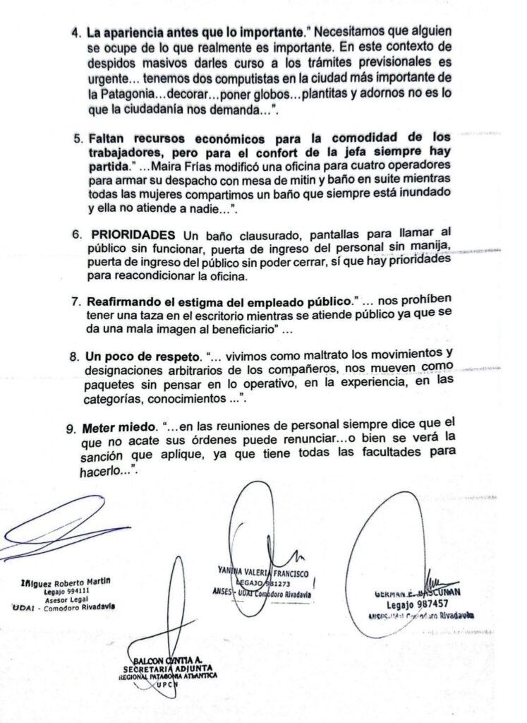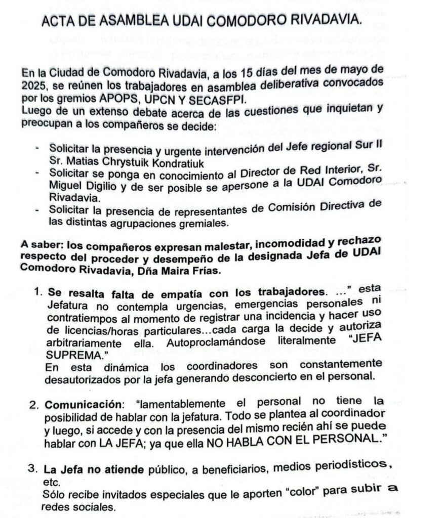 El conflicto quedó reflejado en un acta de asamblea realizada el 15 de mayo de 2025, convocada por los gremios APOPS, UPCN y SECASFPI, en la que los empleados manifestaron su malestar, incomodidad y rechazo respecto del proceder de la jefa. En ese documento se describen distintas situaciones que, según afirman, deterioraron el clima laboral dentro de la delegación.