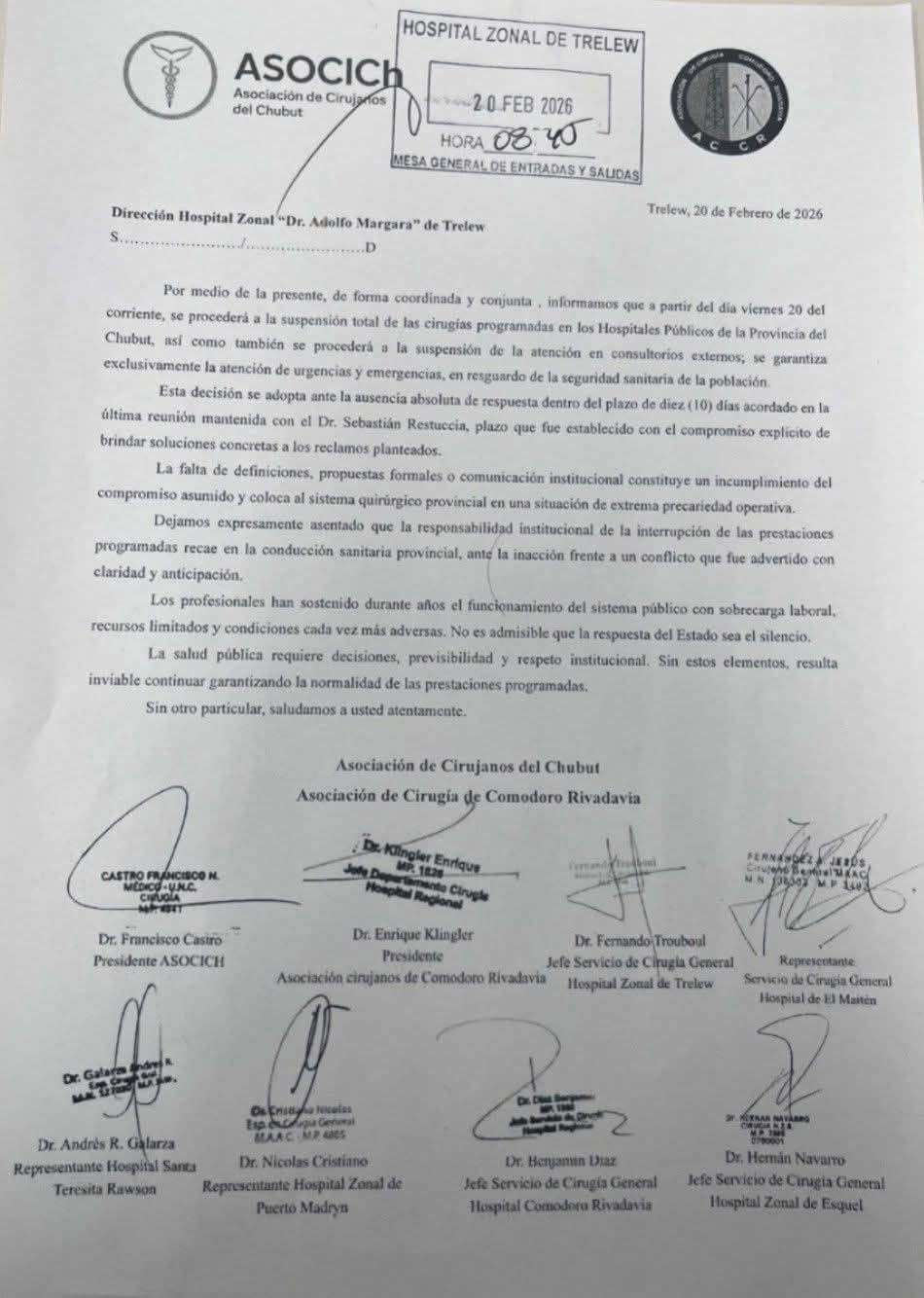 La Asociación de Cirujanos del Chubut (ASOCICH) informó la suspensión total de las cirugías programadas en los hospitales públicos provinciales, así como también la interrupción de la atención en consultorios externos vinculados al área quirúrgica. La medida comenzó a regir el viernes 20 de febrero y fue notificada por escrito a la Dirección del Hospital Zonal “Dr. Adolfo Margara” de Trelew.
