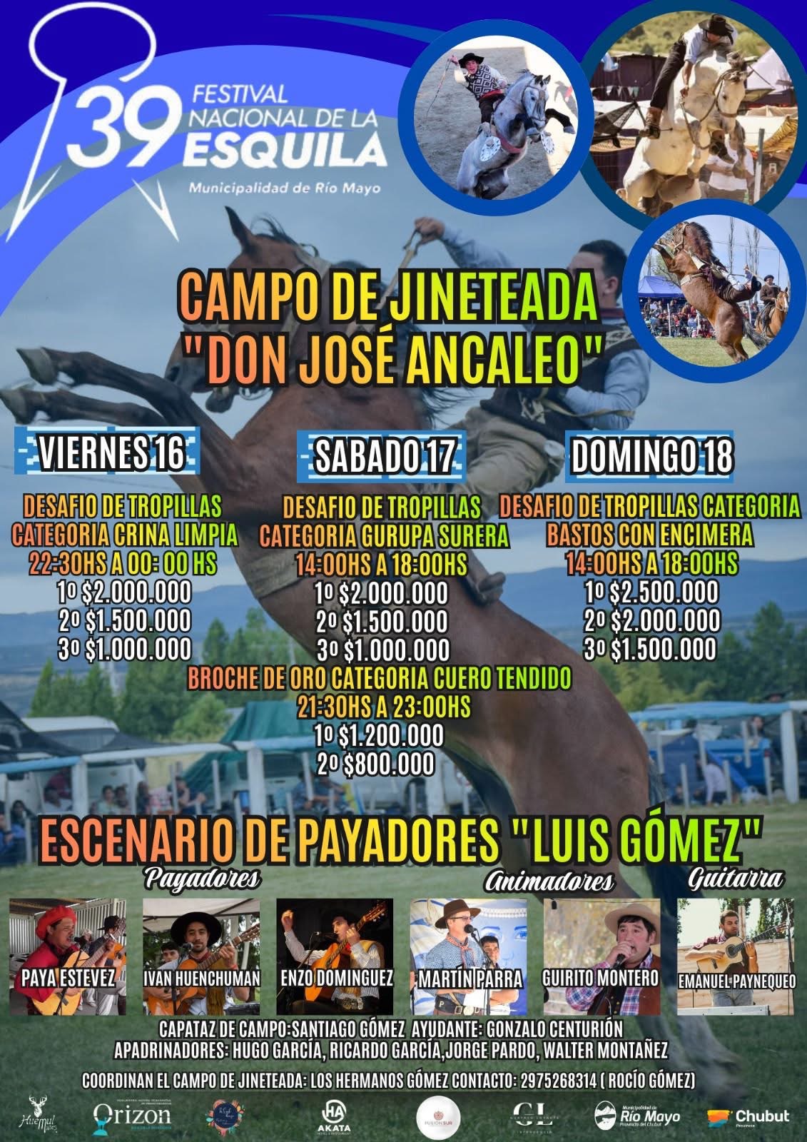 En el marco de la 39° edición del Festival Nacional de la Esquila, la organización confirmó el programa completo del Campo de Jineteada “Don José Ancaleo”, que tendrá actividad durante las tres jornadas del festival, con importantes premios económicos y la participación de tropillas y jinetes de la región.