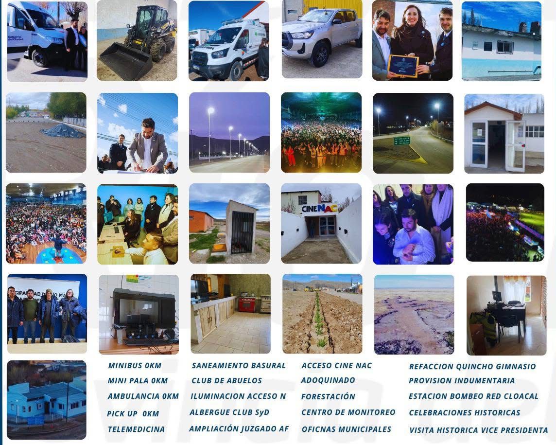 La publicación oficial enumeró adquisiciones, mejoras edilicias y obras menores: minibús, mini pala, ambulancia y pick up 0 km; refacción del quincho del gimnasio; ampliación del Juzgado de Faltas; nuevas oficinas municipales; saneamiento del basural; iluminación del acceso norte; estación de bombeo para la red cloacal y trabajos de adoquinado. También se incluyeron acciones de gestión como la provisión de indumentaria, la implementación de telemedicina, el acceso al programa Cine Nacional, mejoras en el Club de Abuelos y el albergue del Club Social y Deportivo, además de celebraciones históricas y la visita protocolar de la vicepresidenta de la Nación.
