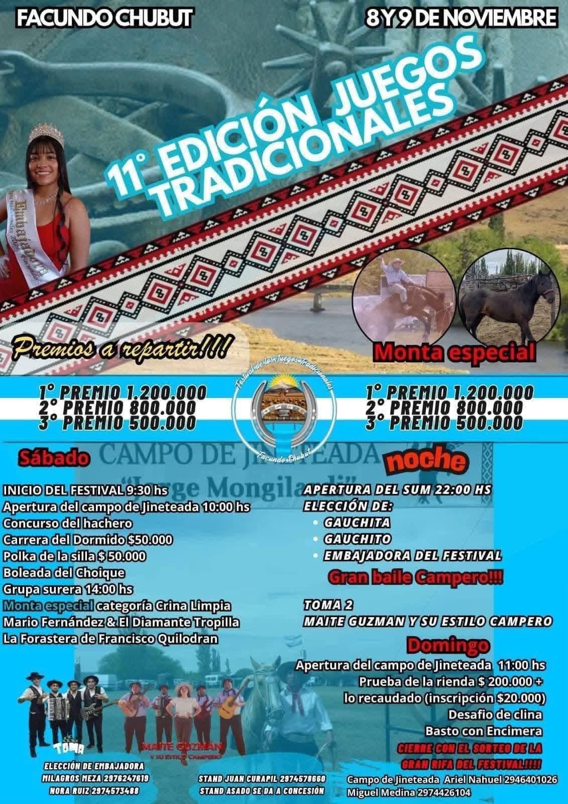 La localidad de Facundo, en el sur de Chubut, será sede este fin de semana —8 y 9 de noviembre— de la 11° Edición de los Juegos Tradicionales, un evento que combina jineteada, destrezas criollas, espectáculos musicales y baile campero, convocando a jinetes, tropilleros y familias de toda la región.