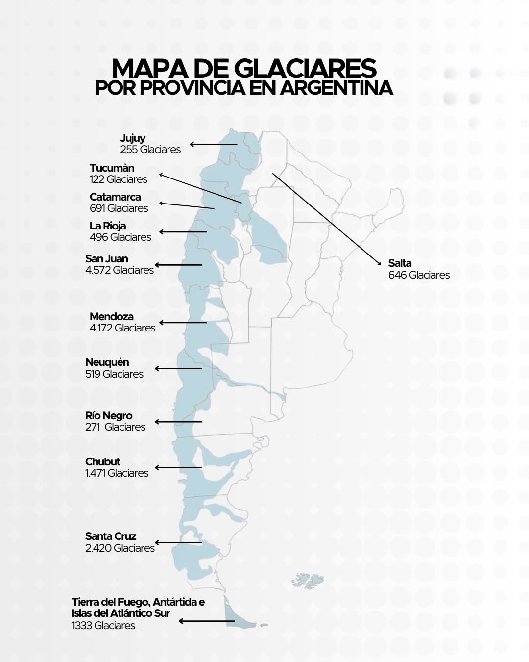 Argentina es uno de los territorios con mayor superficie glaciar de América del Sur fuera de la Antártida. El Inventario Nacional de Glaciares identifica miles de cuerpos de hielo desde Jujuy hasta Tierra del Fuego. San Juan encabeza el registro con 4.572 glaciares, seguida por Mendoza con 4.172 y Santa Cruz con 2.420. En la Patagonia central, Chubut registra 1.471, mientras que Neuquén contabiliza 519 y Río Negro 271.