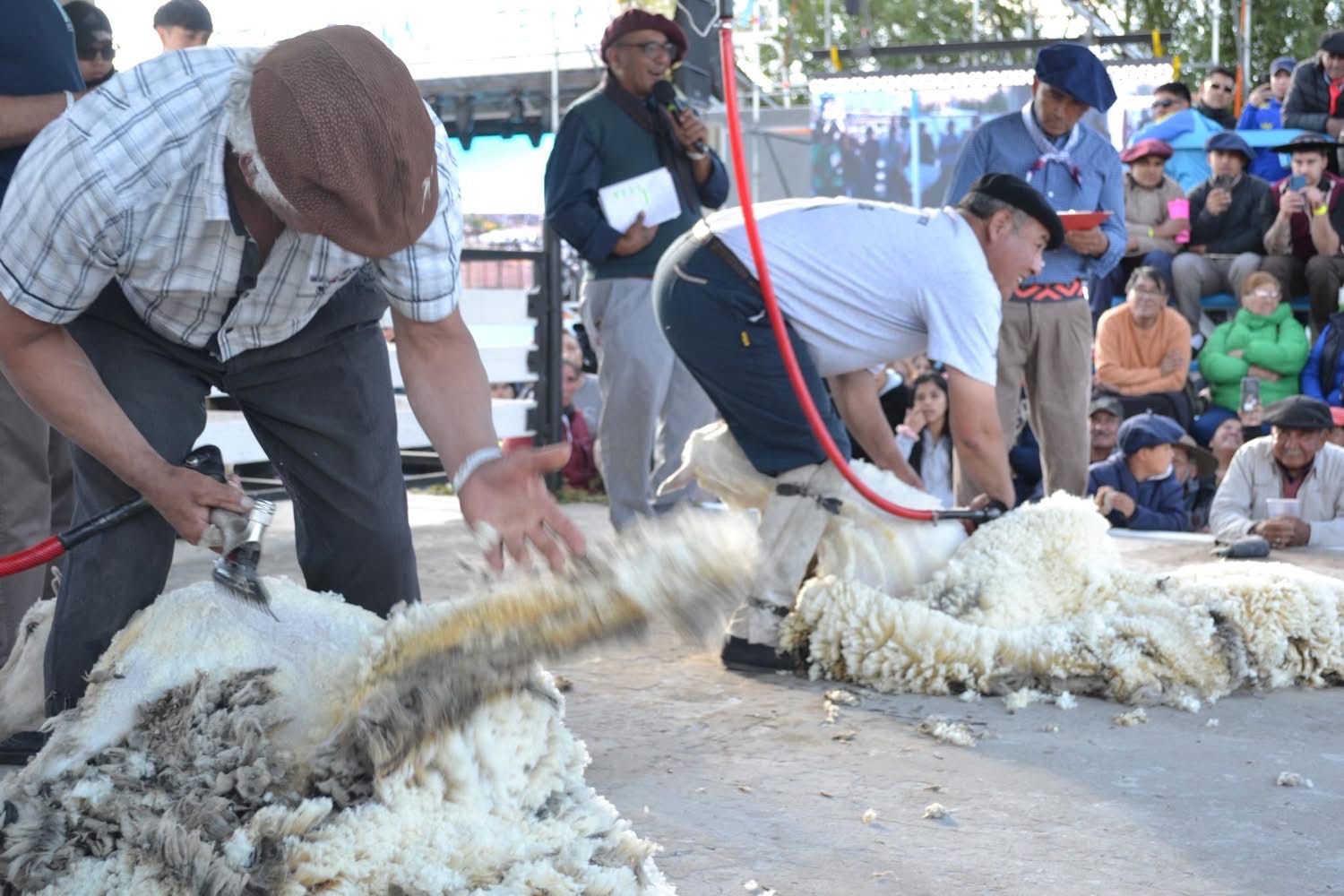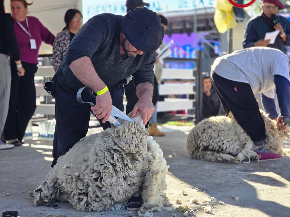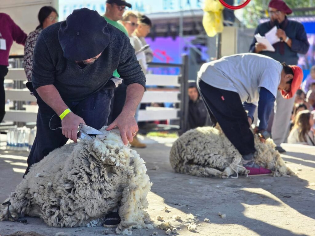 El sábado comenzó temprano, desde las 10 de la mañana, con la continuidad del campeonato de esquila en el escenario Pedro Calluán. A lo largo de la jornada, la esquila no fue solo un espectáculo para observar: parte del público, especialmente quienes no conocían el oficio, pudo participar activamente de la experiencia, animándose a esquilar ovejas bajo la supervisión de esquiladores experimentados, en una propuesta que despertó curiosidad y acercó a vecinos y visitantes a una práctica central de la identidad productiva regional.