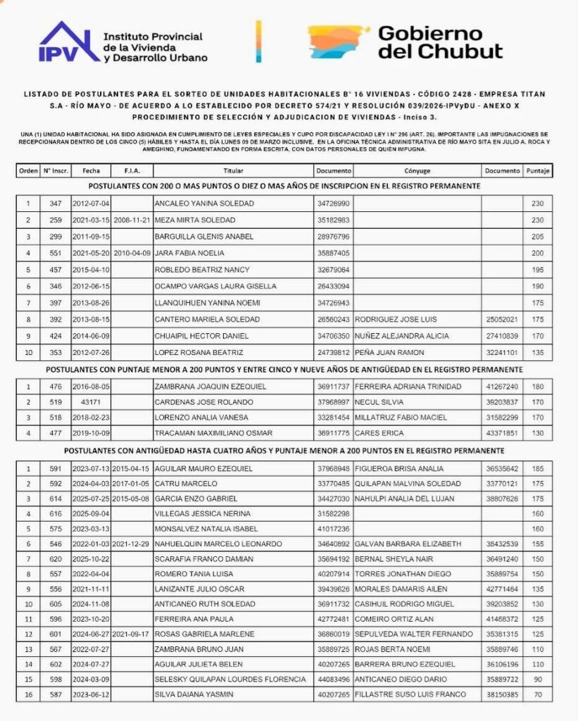 El Instituto Provincial de la Vivienda y Desarrollo Urbano (IPVyDU) publicó el listado de postulantes habilitados para el proceso de adjudicación de las 16 viviendas que se construyen en Río Mayo, correspondiente a la obra identificada como Barrio 16 Viviendas, ejecutada por la empresa Titan S.A., actualmente en etapa de finalización.