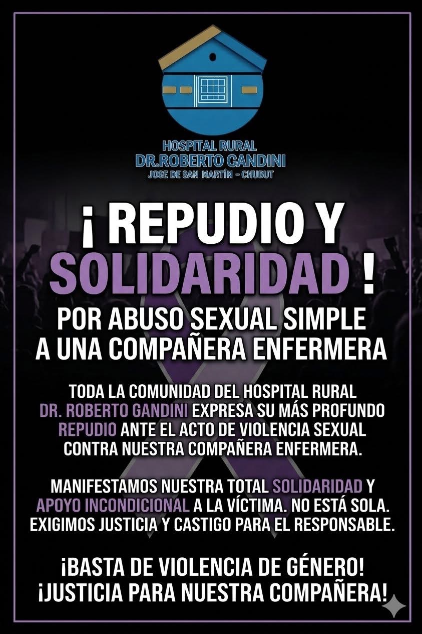 El Hospital Rural Dr. Roberto Gandini expresó su repudio ante un hecho denunciado que tiene como víctima a una trabajadora de la salud. La causa ya cuenta con intervención judicial a través del Ministerio Público Fiscal de la ciudad de Esquel, aunque no se brindaron detalles por tratarse de una instancia inicial y de extrema sensibilidad. La situación generó un fuerte impacto tanto en el ámbito sanitario como en la comunidad en general, donde el caso comenzó a circular con preocupación en las últimas horas.