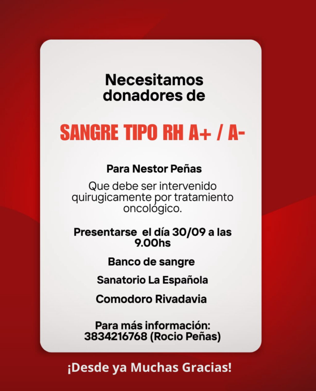 Se necesitan dos dadores de sangre de grupo A+ o A-, quienes deberán presentarse el martes 30 de septiembre, a partir de las 9:00 horas, en el Banco de Sangre de La Española, sucursal Mitre, en la ciudad de Comodoro Rivadavia.