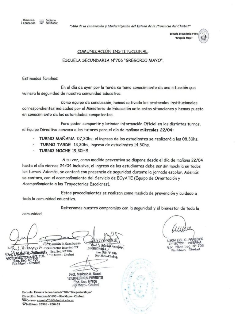 De acuerdo al documento, el equipo de conducción activó los protocolos correspondientes establecidos por el Ministerio de Educación de Chubut y dio intervención a las autoridades competentes. En ese marco, se dispuso una serie de medidas preventivas que comenzarán a regir desde este miércoles 22 de abril y se extenderán hasta el viernes 24 inclusive.