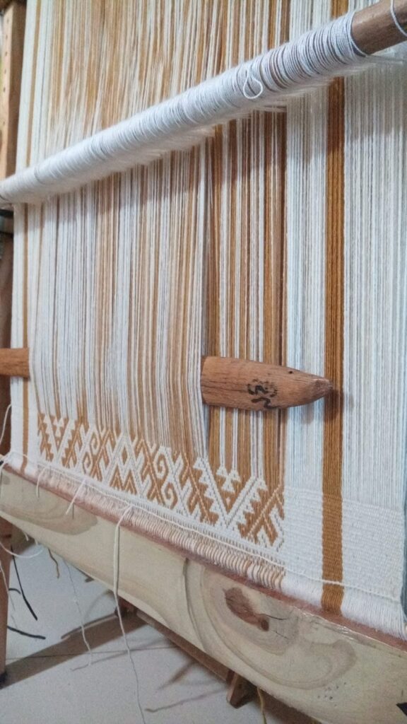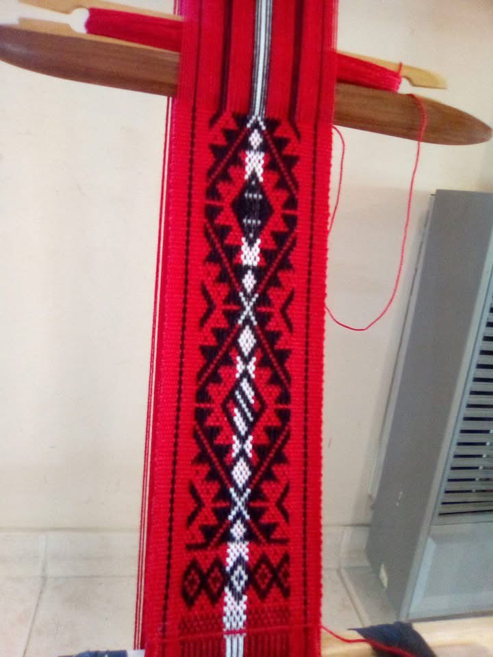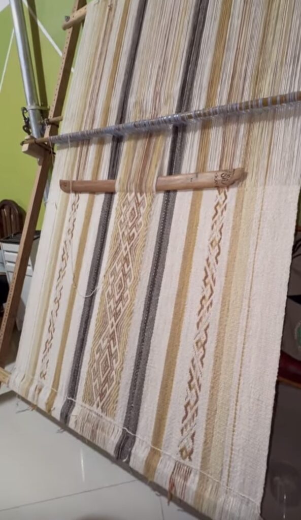 El palo curvo de golpear acompaña ese movimiento con una cadencia firme y antigua: marca el pulso, aprieta la trama, da cuerpo al sonido del tejido.