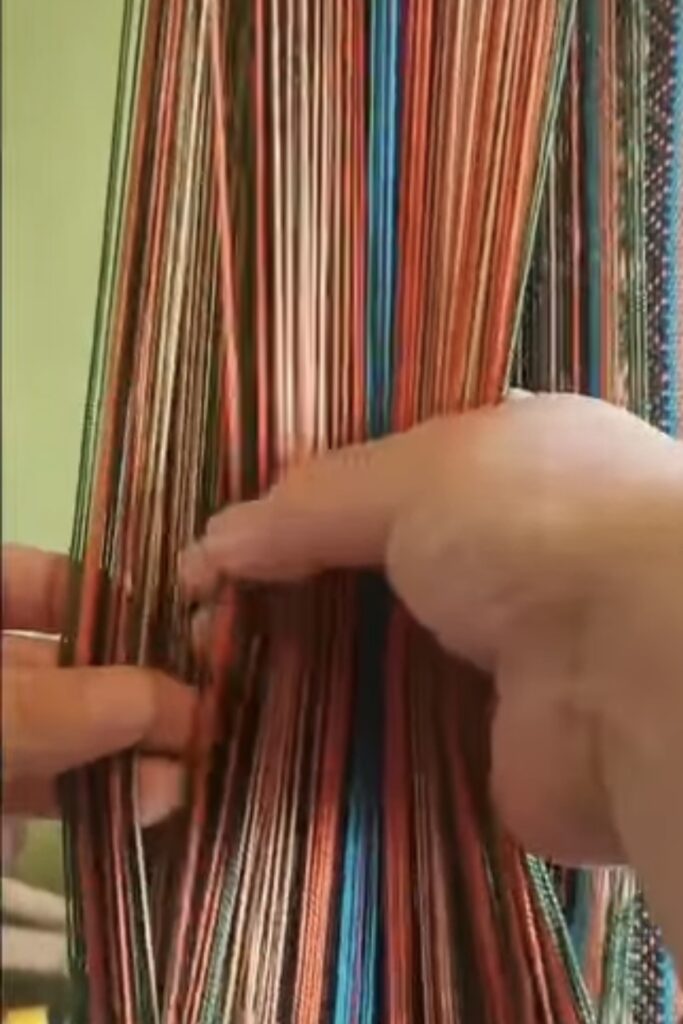 Las hebras tensadas parecen cuerdas de un arpa invisible, y los dedos de Cristina se deslizan sobre ellas con la delicadeza de quien ejecuta una melodía secreta.