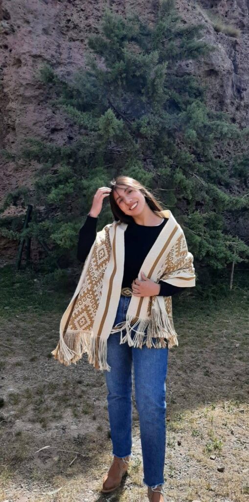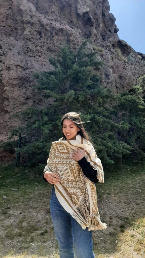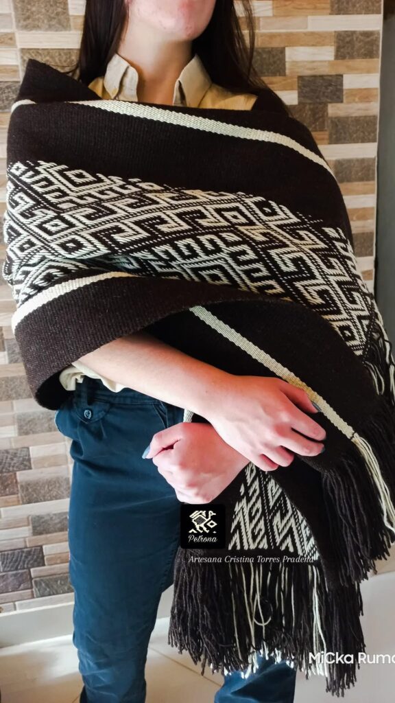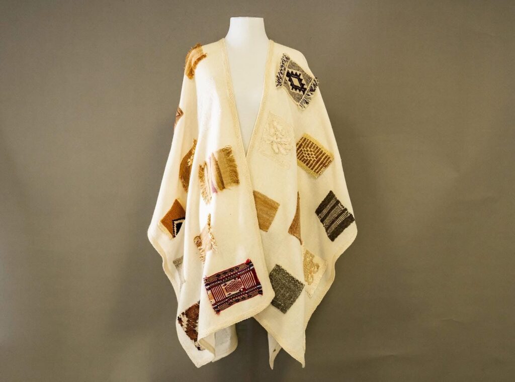 Su ruana tejida en telar ancestral, trabajada con lana natural y sintética, fue destacada por su precisión técnica y su simbolismo patagónico.