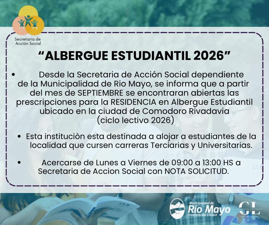 La Secretaría de Acción Social de la Municipalidad de Río Mayo anunció que ya se encuentran abiertas las prescripciones para acceder a la Residencia en el Albergue Estudiantil, ubicado en la ciudad de Comodoro Rivadavia, correspondiente al ciclo lectivo 2026.