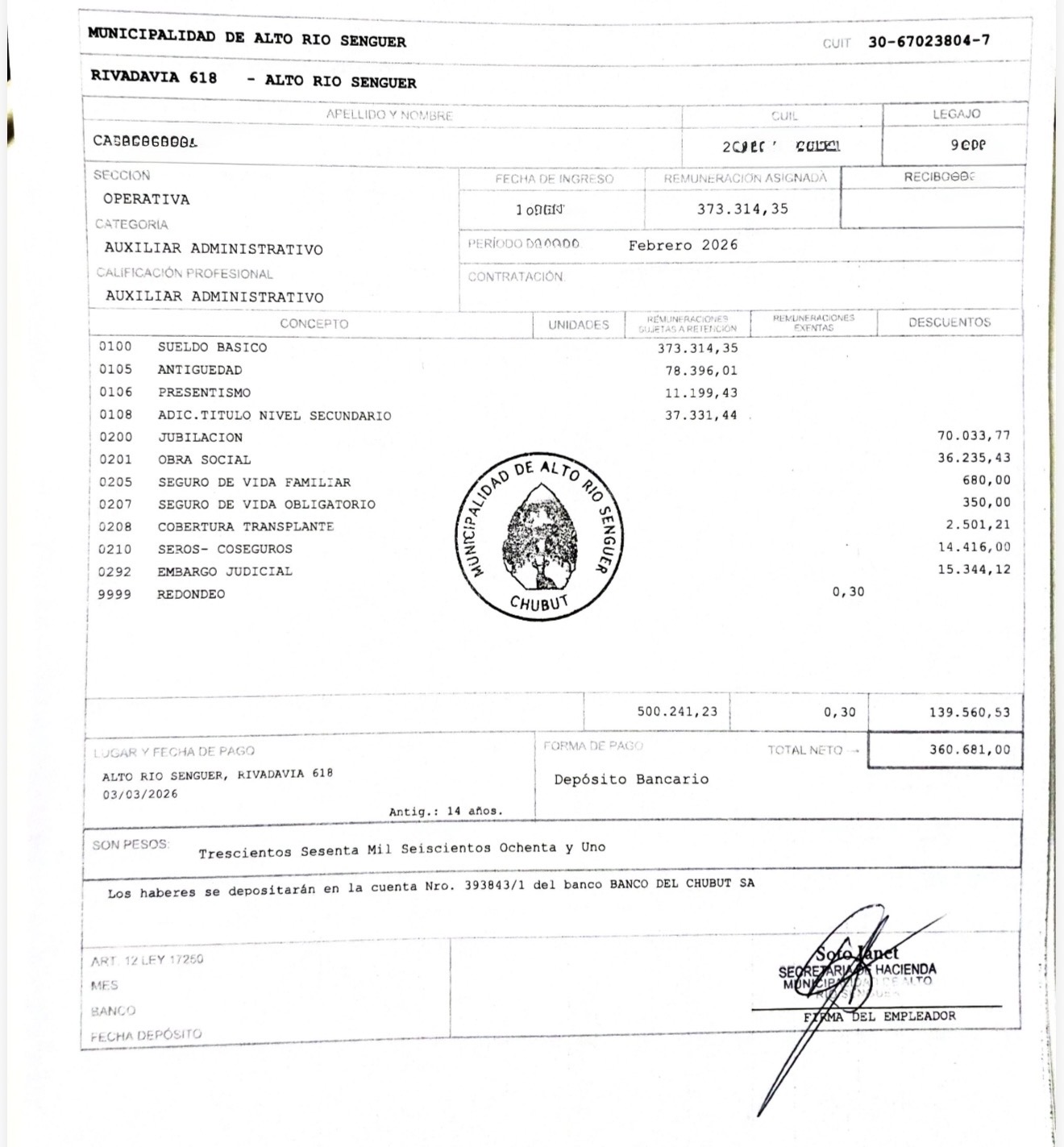 El caso se conoció a partir de una publicación en redes sociales realizada por un empleado municipal, donde mostró su liquidación correspondiente a febrero de 2026: un ingreso neto de $360.681. A partir de esa exposición, Río Mayo 1935 tomó contacto con el trabajador para conocer en profundidad su situación.