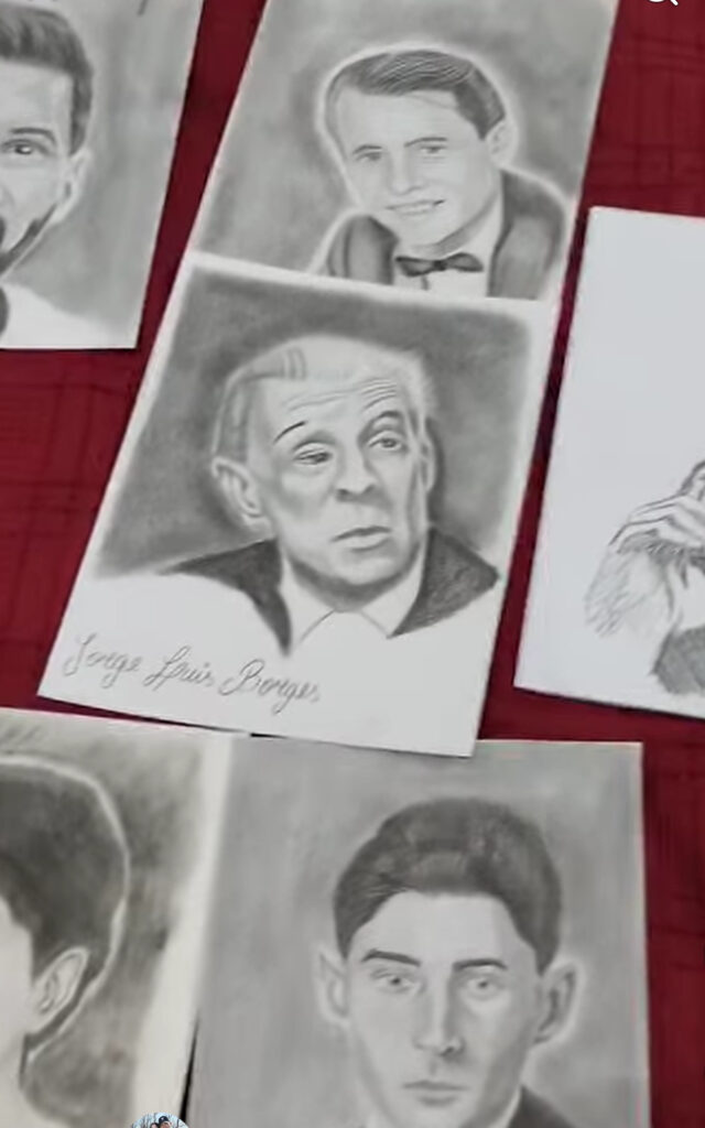 Entre los trabajos exhibidos en la feria destacaron retratos de personalidades de la literatura universal, como Jorge Luis Borges, que recibió elogios por la fidelidad en los rasgos y la intensidad en la mirada.